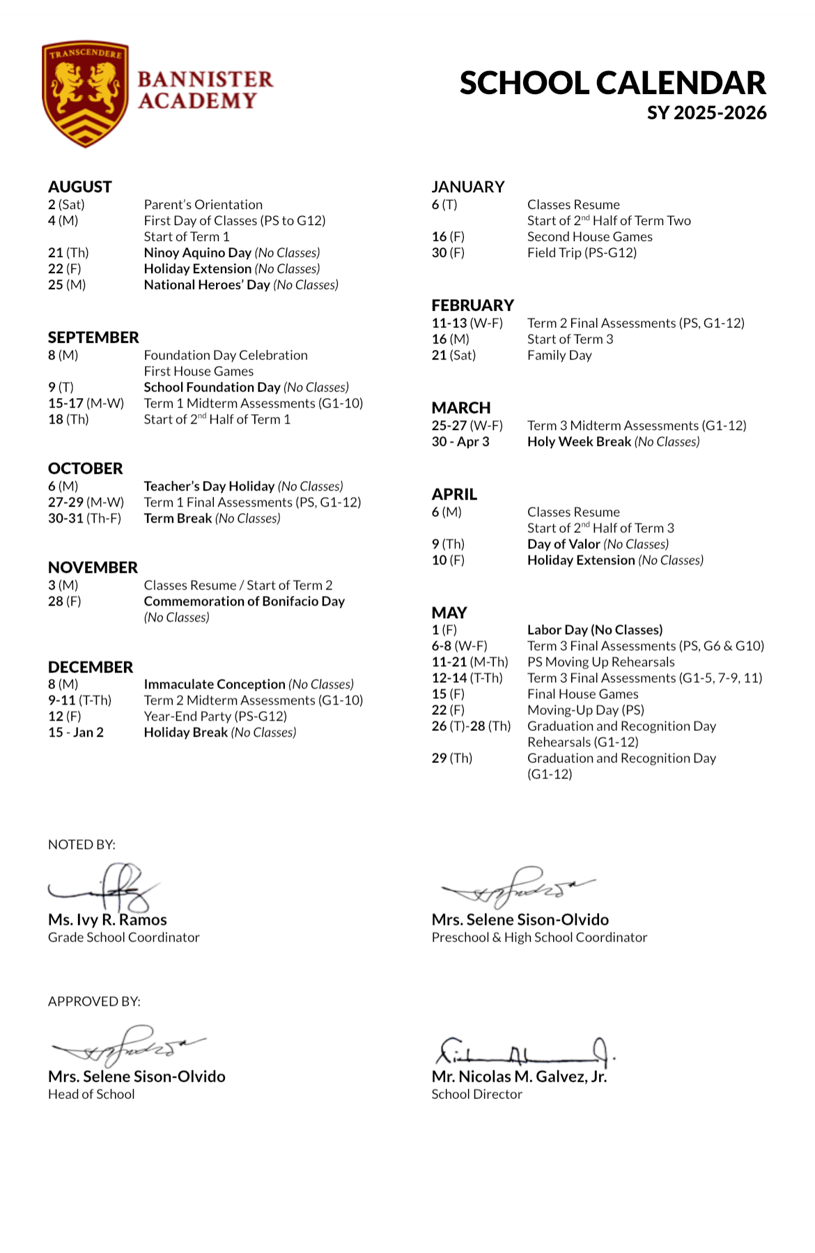 Bannister Academy Calendar SY 2025-2026